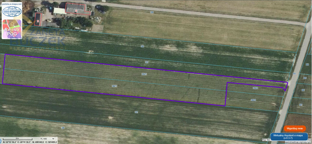 Doskonała lokalizacja - cicha i spokojna okolica, z dala od zgiełku i hałasu. W odległości około 2 km od działki znajduje się szkoła, sklep i kościół. Odległość do Sochaczewa wynosi około 5 km.
