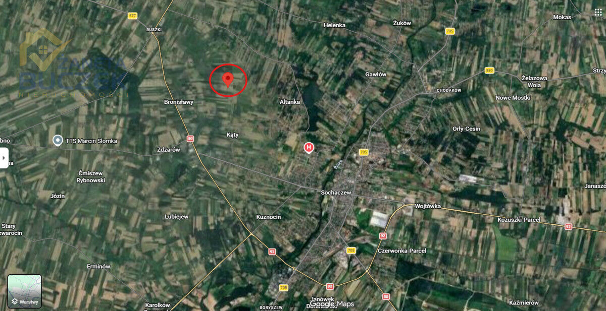 Sprzedam działkę w kształcie prostokąta o pow. 7722 m2 w miejscowości Bronisławy, w gminie Sochaczew.1720 m2 objęte jest Miejscowym Planem Zagospodarowania Przestrzennego, który określa ten teren jako przeznaczony pod zabudowę zagrodową. Pozostałą część nieruchomości MPZP nie obejmuje i można wnioskować o warunki zabudowy.